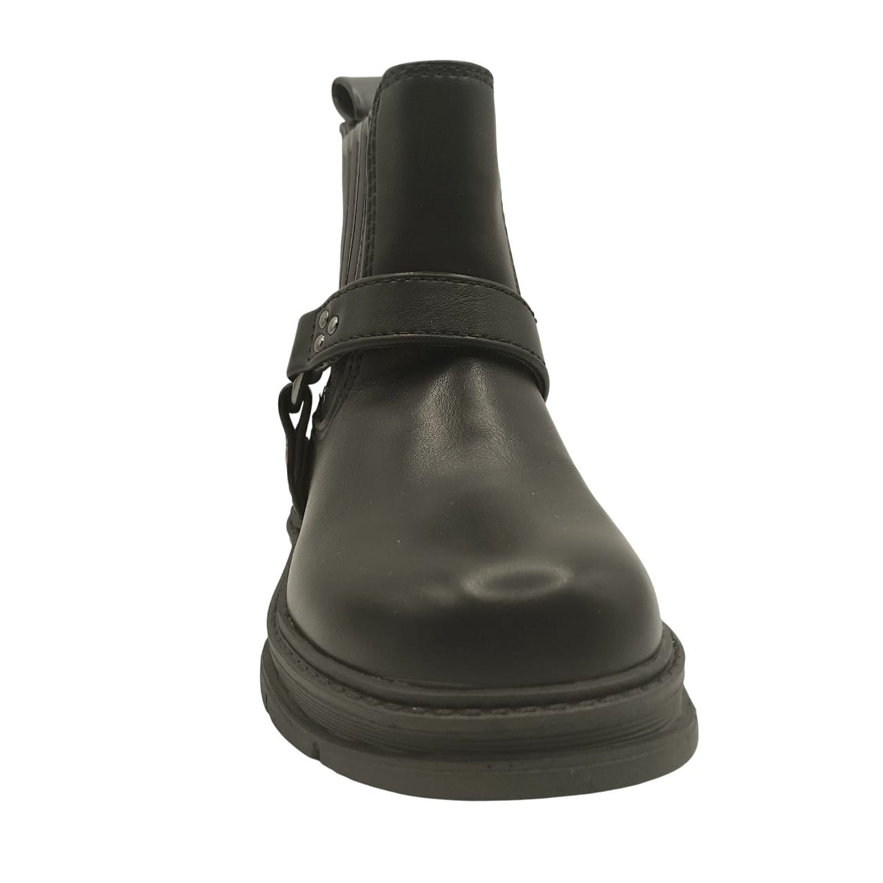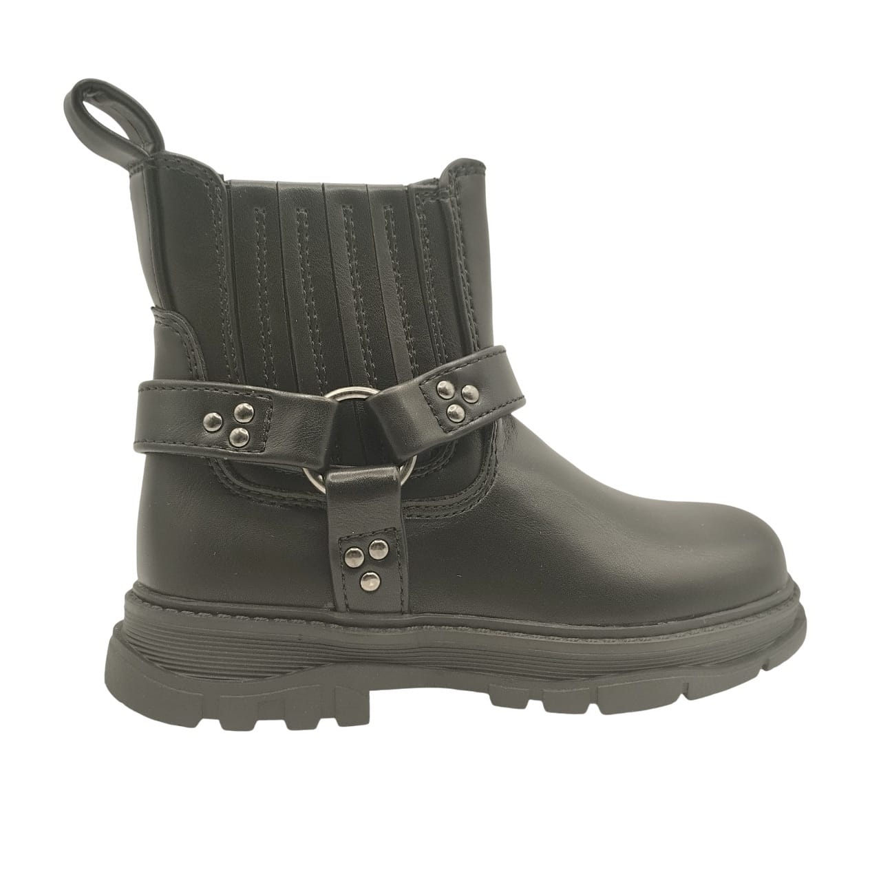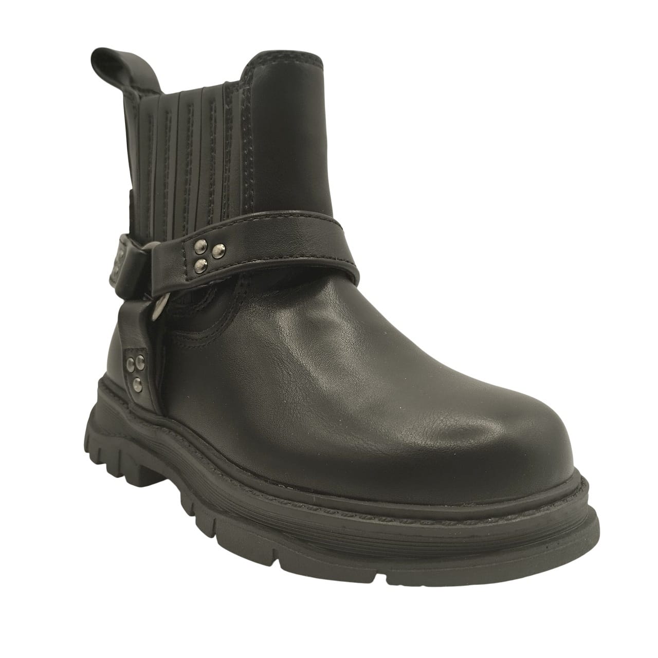 La Bota motera estilo rockero Double King FH3833 para niño aporta un look moderno y atrevido en color negro. Elaborada en piel sintética de calidad, combina resistencia y confort para el uso diario. Su cierre con cremallera lateral permite un calce fácil y seguro. Los detalles metálicos y la hebilla decorativa realzan su carácter rebelde y original. El calzado ideal para acompañar a los más pequeños con estilo y personalidad en cada aventura.